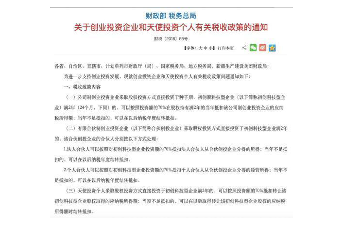 2018年5月,由財政部、稅務總局聯(lián)合發(fā)布了《關于創(chuàng)業(yè)投資企業(yè)和天使投資個人有關稅收政策的通知》,又稱“財稅55號文”。
